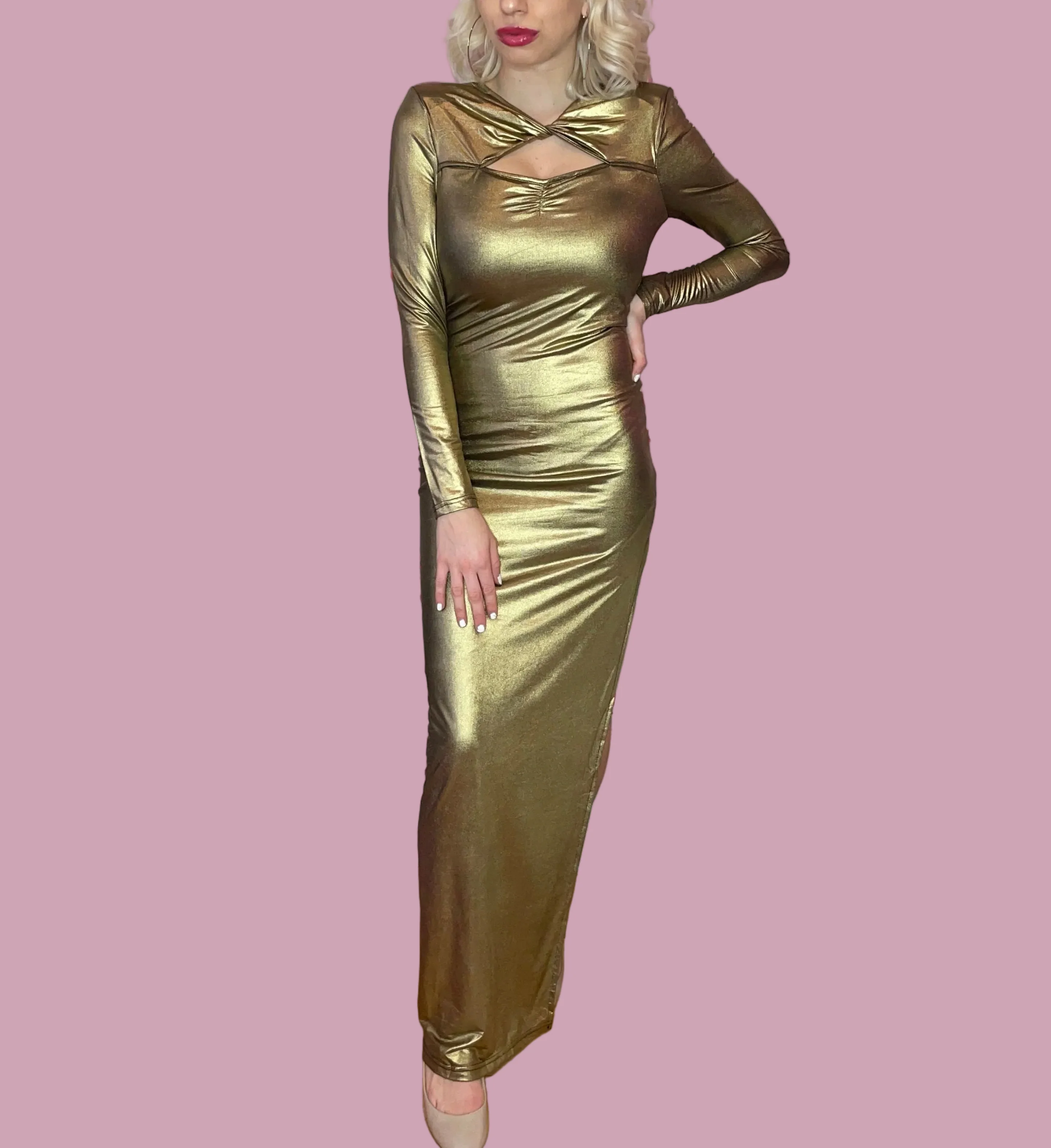Turn heads and steal the spotlight in the Metallic Long Sleeve Gown. This show-stopping maxi dress features a luxurious metallic finish that catches the light with every movement, creating an unforgettable glamorous effect. The long sleeves add sophisticated coverage while the floor-length silhouette creates an elegant, elongated look perfect for your most special occasions.