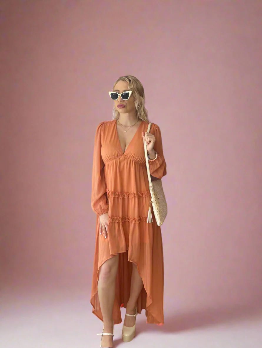V Neck Tiered Hi Low Maxi